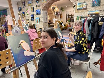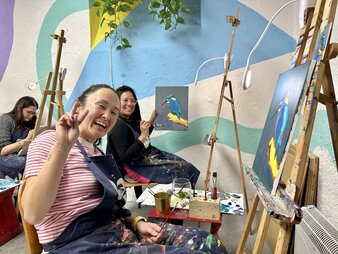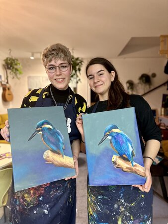 Ihr malt jeweils auf einer eigenen Leinwand – aber das Motiv ist auf beide aufgeteilt. Zusammengefügt ergeben die Bilder ein stimmiges Ganzes – wie zwei Hälften, die sich perfekt ergänzen.