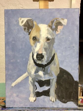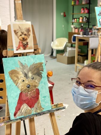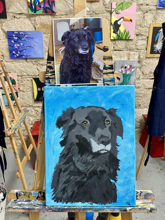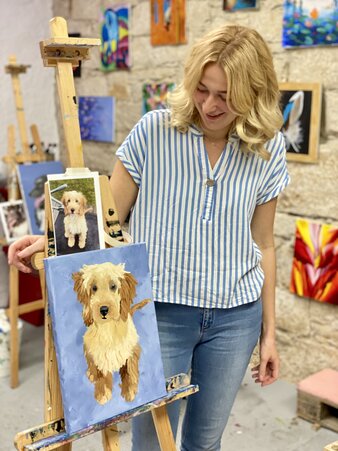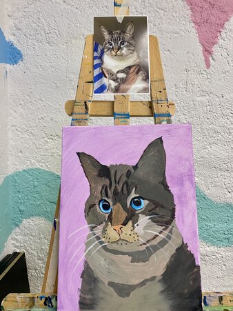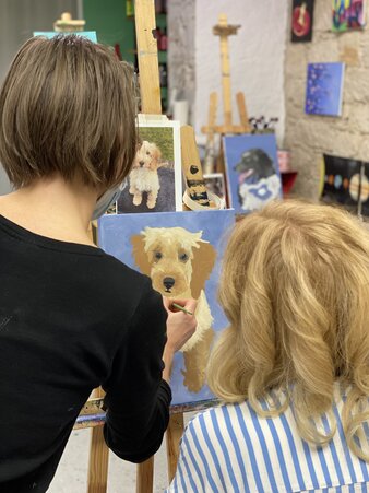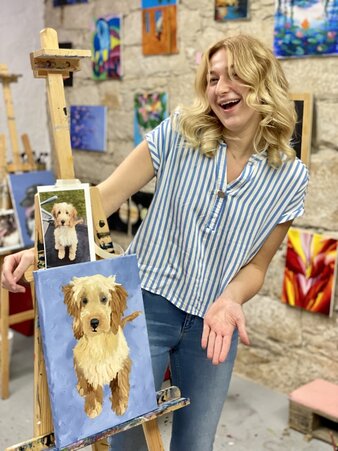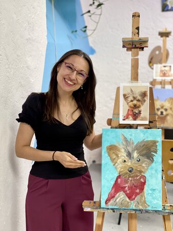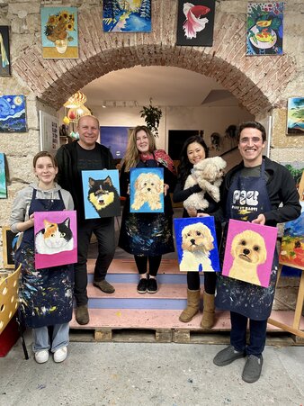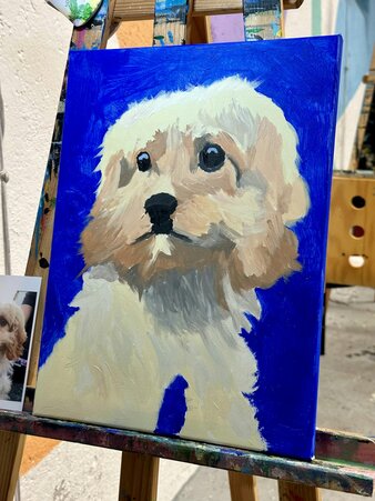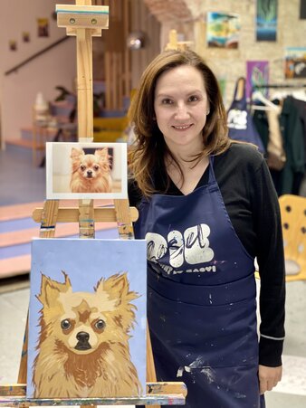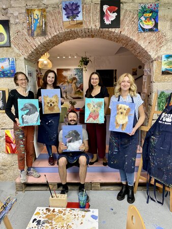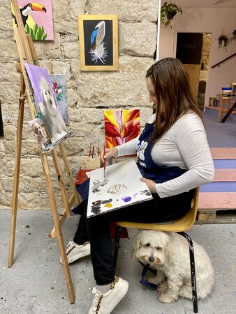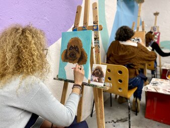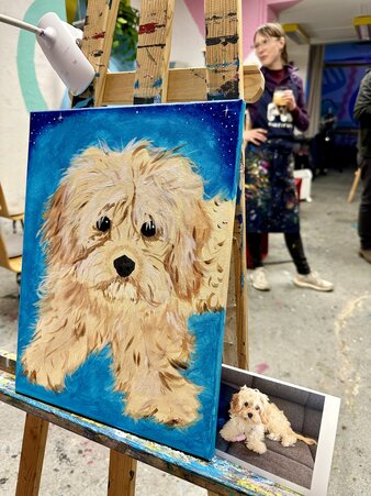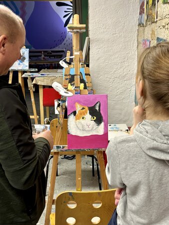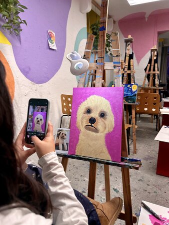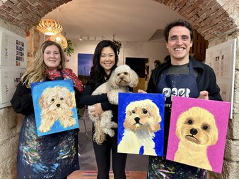 Nach deiner Buchung schickst du uns ein paar Fotos deines Tieres. Unsere Künstlerin wählt das beste aus und bereitet eine individuelle Vorlage für dich vor. Wenn du dann ins Studio kommst, wartet dein Canvas (oder – halt dich fest – ein Keramikteller!) schon auf dich. Ja, du kannst dein Tier auch auf einen Teller malen. Stell dir vor, Spaghetti essen mit Blick auf dein Kaninchen. Einfach ikonisch.