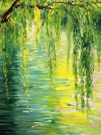 Wir malen einen ruhigen Teich, umrahmt von den hängenden Ästen einer Weide – alles in warmem Limonengrün, Gelbtönen und zartem Sonnenlicht getaucht.