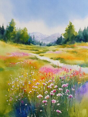 In dieser Aquarell-Malsession halten wir eine weitläufige, fliessende Wiese voller Blumen fest, mit satten, warmen Grüntönen, die sich durch eine bergige Landschaft ziehen. Es ist eine Szene voller Sanftheit, Atmosphäre und leiser Bewegung – in der Licht, Nebel und Farbe ganz natürlich ineinander übergehen.