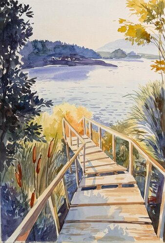 Das Aquarell lässt die Szene offen bleiben – Licht, das ins Wasser gleitet, Bewegung, die sich in Ruhe auflöst. Was bleibt, ist kein Ziel, sondern eine Pause. Ein Raum, in dem nichts mehr sein muss, als es ist.
