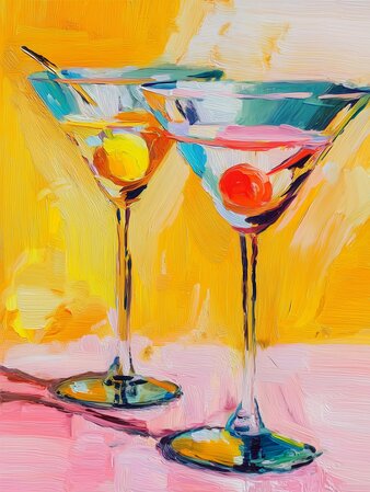 This painting is pure sunshine on canvas — bright yellows, juicy pinks, electric blues, and cocktails that look like they’re ready to clink right off the edge. It’s got that carefree, beach-bar energy: warm nights, loud laughter, and drinks that somehow taste better just because the world feels golden.