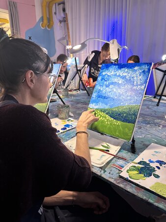You can choose to paint in pairs, where two canvases become one artwork. The theme will be split in two, and each of you paints one half that aligns perfectly with the other.