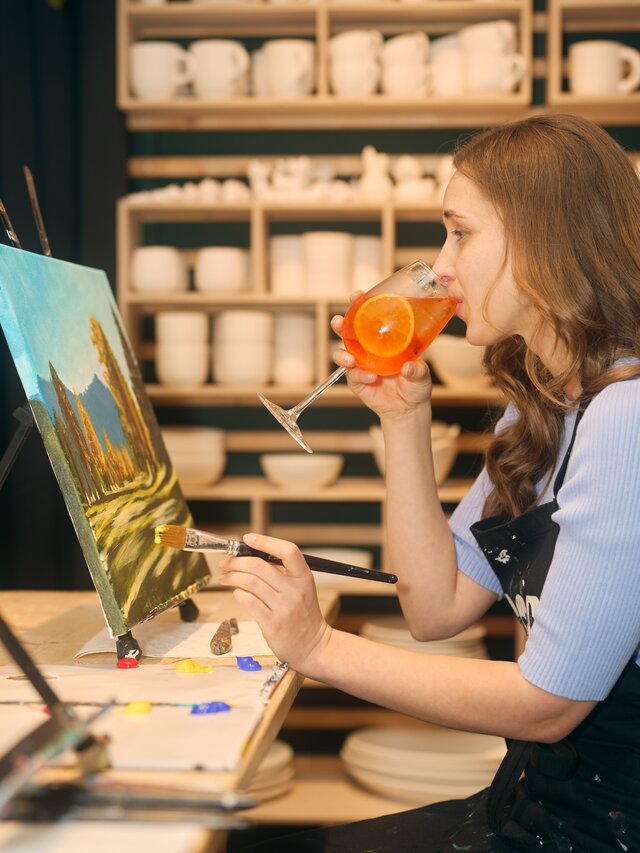 There's no school desk atmosphere here and no strict rules - just paints, brushes, palette knives and a huge playing field for your creativity! Talent is not important here - the main thing is that you like colour and have a good time. And best of all: a welcome drink is on the house.