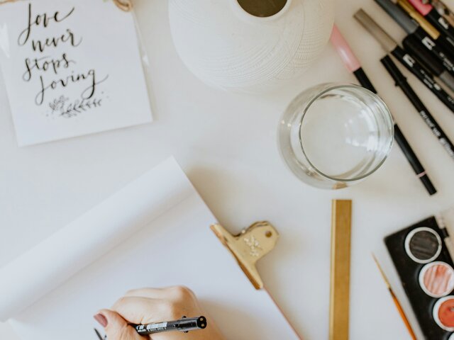 Theorie ist gut – aber wir setzen auf Praxis. Klar, du bekommst die Basics erklärt. Aber das Wichtigste ist, dass du von Anfang an selbst loslegst. Mit Feder und Tinte startest du in die Welt der Kalligraphie und probierst später unterschiedliche Materialien wie Pinsel, Filzstifte oder Gouache aus. Ganz nach deinem Geschmack. Ob elegante Schrift, moderne Kalligraphie oder kunstvolle Schwünge – du entdeckst bei uns, was am besten zu dir passt.