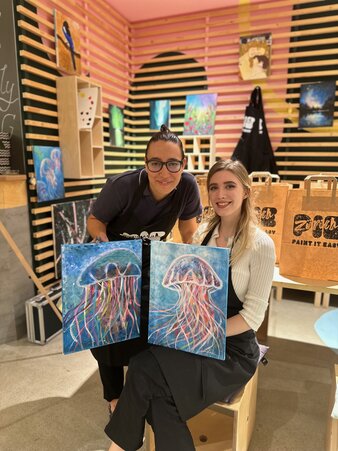 Ihr malt jeweils auf einer eigenen Leinwand – aber das Motiv ist auf beide aufgeteilt. Zusammengefügt ergeben die Bilder ein stimmiges Ganzes – wie zwei Hälften, die sich perfekt ergänzen.