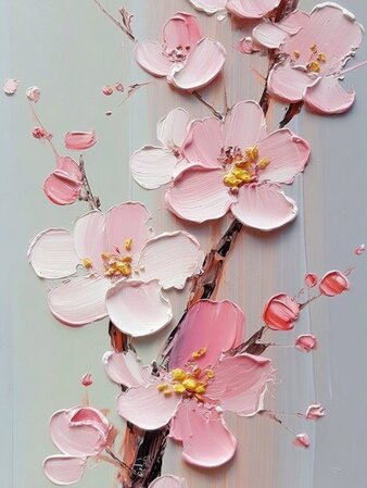 In diesem Textur-Acryl-Malkurs gestaltest du einen verträumten Kirschblüten-Ast in zarten Rosatönen vor einem verwaschenen Pastellhintergrund. Mit Modellierpaste baust du dicke, samtige Blüten und einen kräftigen Ast, der fast aus dem Bild herauskommt.