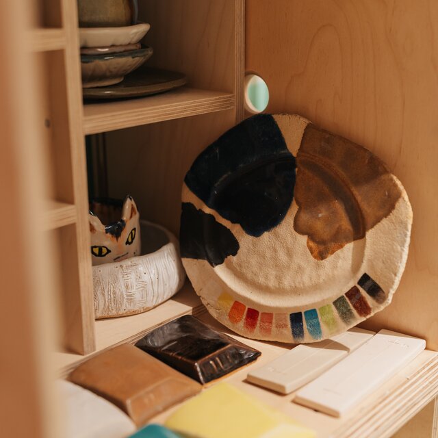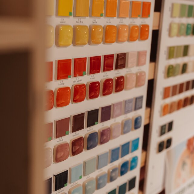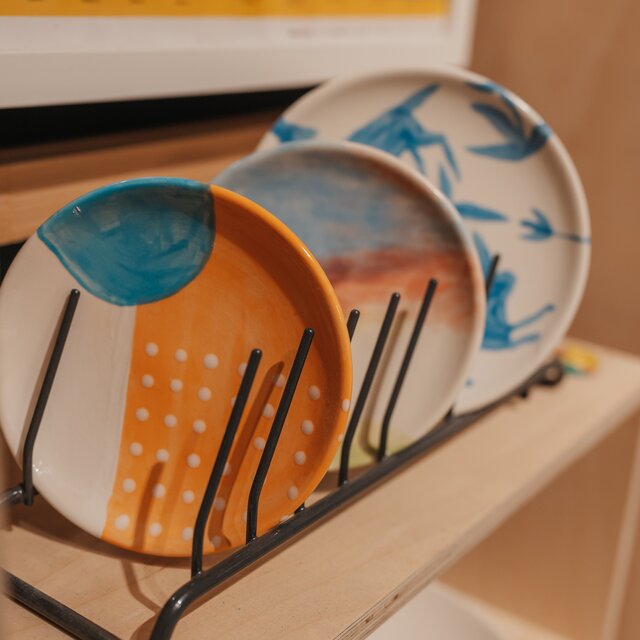 Nach dem Bemalen übernehmen wir den wichtigsten Part: Dein Werk kommt in den Keramikofen, wo die Farben eingebrannt werden. So wird dein Geschirr lebensmittelecht, kratzfest und spülmaschinenfest. Schon nach etwa einer Woche kannst du dein fertiges Stück abholen. Damit es besonders lange schön bleibt, empfehlen wir trotz Spülmaschinenfestigkeit eine schonende Handwäsche – so leuchten deine Farben noch viele Jahre.