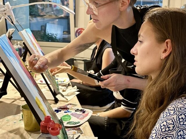 Ihr malt jeweils auf einer eigenen Leinwand – aber das Motiv ist auf beide aufgeteilt. Zusammengefügt ergeben die Bilder ein stimmiges Ganzes – wie zwei Hälften, die sich perfekt ergänzen.