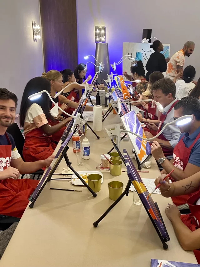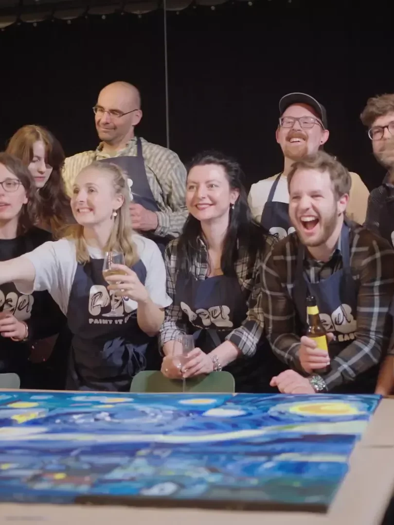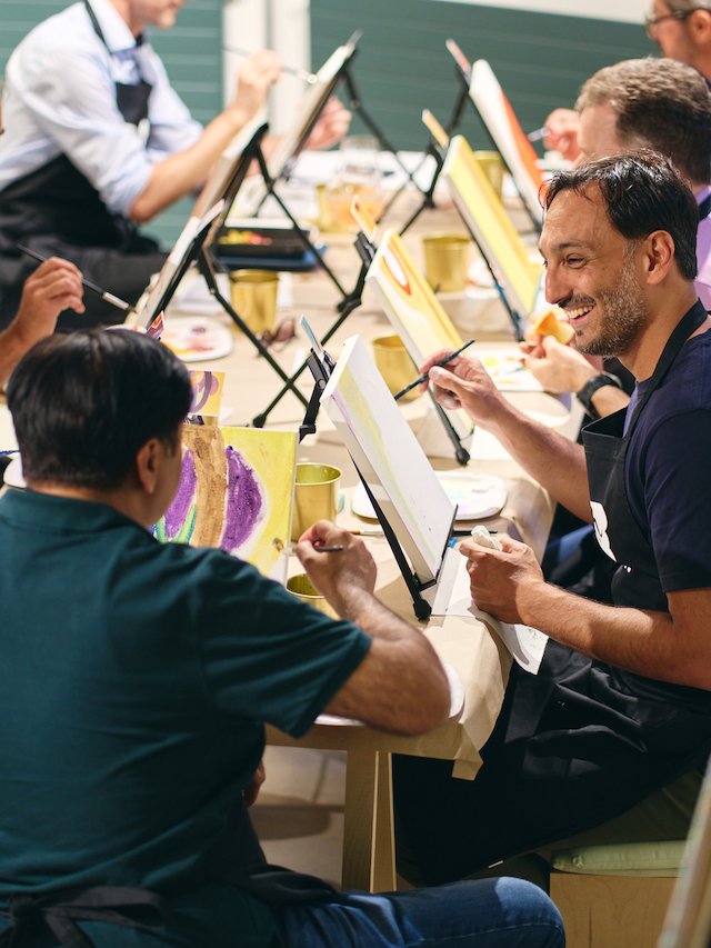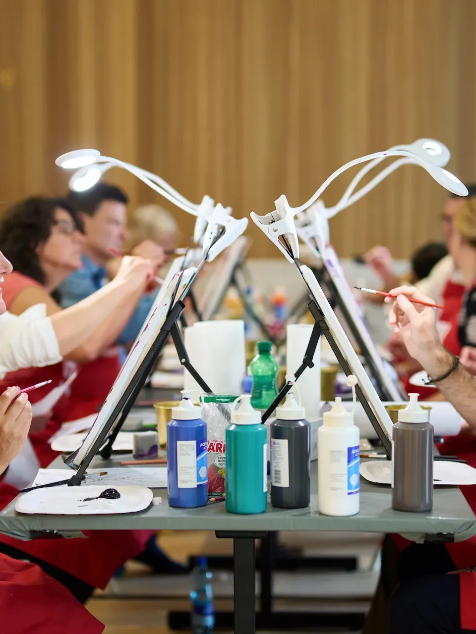 Alles inklusive. Wir stellen alles bereit- Farben, Pinsel, Leinwände, Schürzen und natürlich jede Menge gute Laune. Und das Beste: Du musst dich um nichts weiter kümmern – auch nicht hinterher ums Aufräumen.