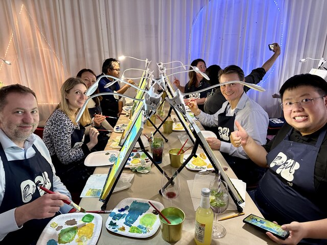 Am Veranstaltungstag bringen wir alle benötigten Malmaterialien zum Veranstaltungsort und bereitet alles vor. Der Kursleitung gibt zunächst einen Überblick über die Materialien und zeigt, wie alles funktioner. Auf Wunsch unterstützt wir auch bei der Gestaltung einer Komposition und einer harmonischen Farbpalette für das Gemälde. Nach der Hälfte des Kurses könnt ihr bei kleinen Snacks eine Pause einlegen und euch austauschen. Zum Abschluss gibt es lustige Teamfotos, und das Gemälde gehört euch. Auf Wunsch organisieren wir in den Folgetagen auch den Transport der Kunstwerke an einen anderen Ort.