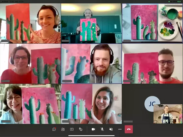 - Teamevent mit Lachgarantie: Gemeinsam pinseln, klecksen und staunen – online, aber mit echtem Teambuilding-Faktor.